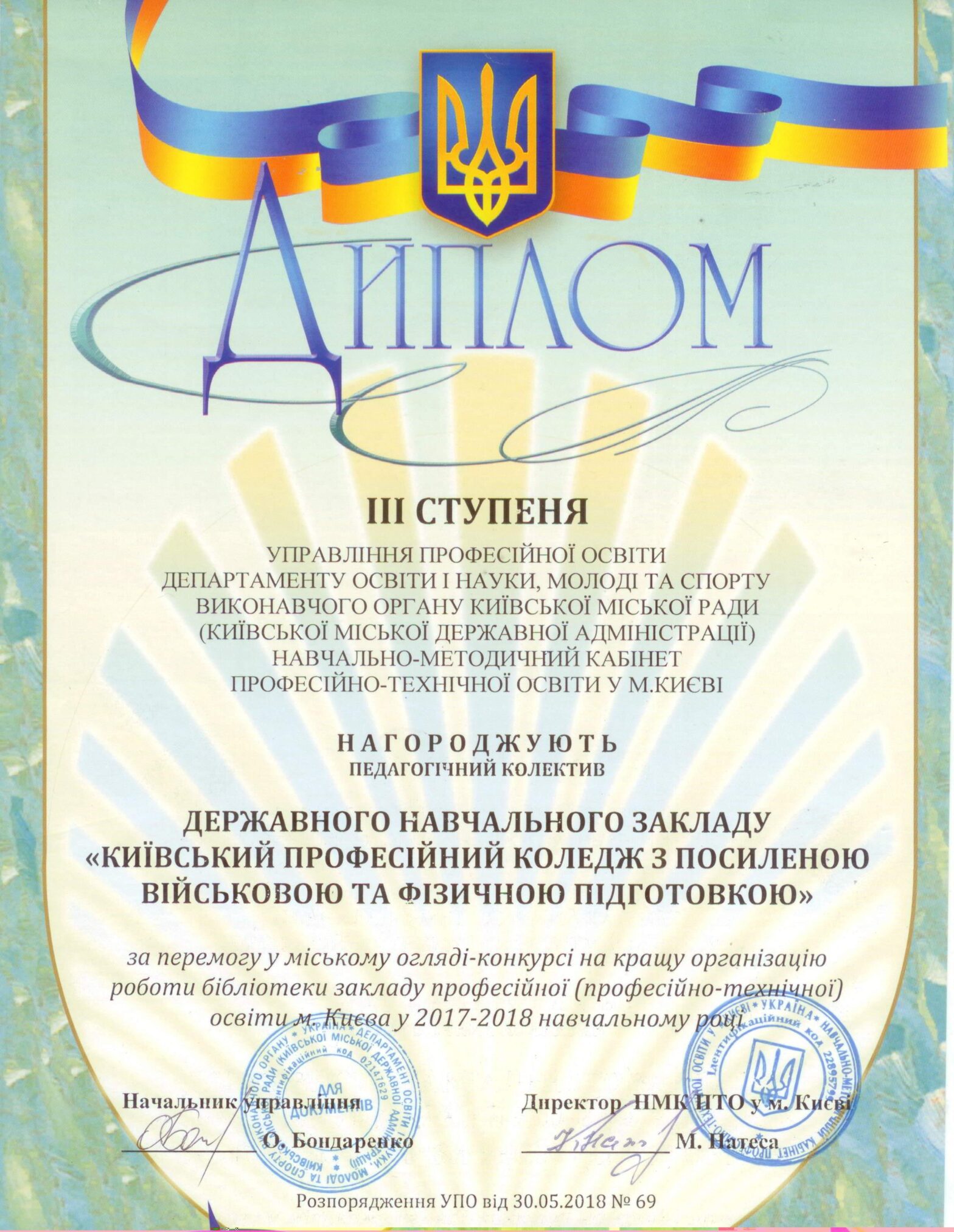 Бібліотека Державного навчального закладу «Київський професійний коледж з посиленою військовою та фізичною підготовкою» удостоєна Диплома III ступеня за перемогу у міському огляді-конкурсі на кращу організацію роботи серед бібліотек закладів професійної освіти м. Києва у 2017–2018 навчальному році.